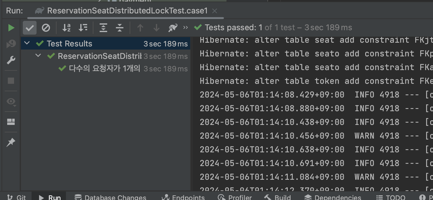 분산락은 스레드 100개로 좌석 예약을 할 경우 3.189초가 소요되었다.