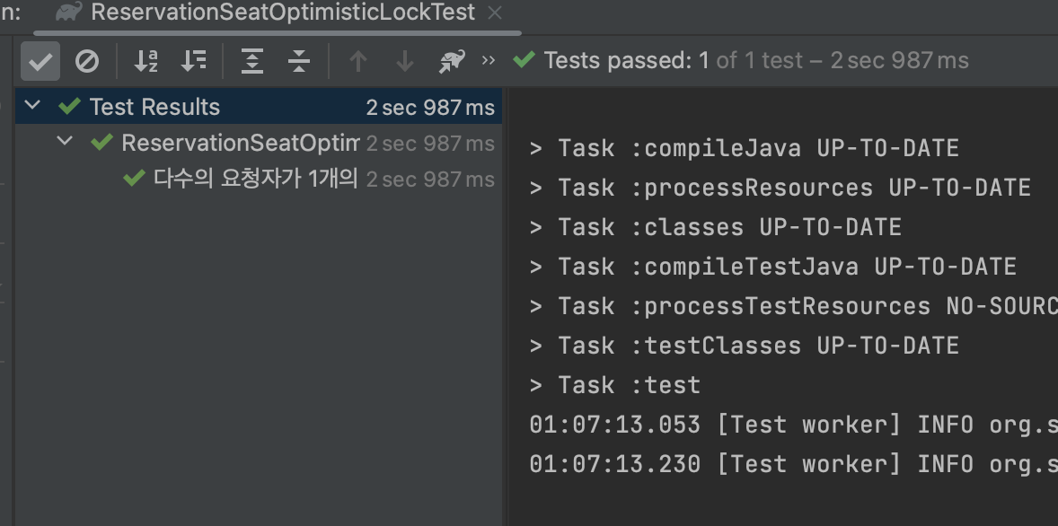 낙관적 락으로 100개의 스레드로 좌석 예약을 시도했을 때 2.987초가 걸렸다.
