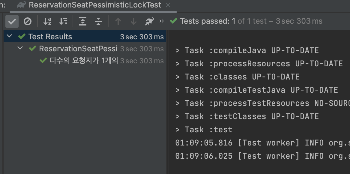 비관적 락의 경우 100개의 스레드로 좌석 예약을 시도하는 경우 3.3초가 소요된다. 낙관적 락보다는 오래 걸리는 것을 확인할 수 있다.